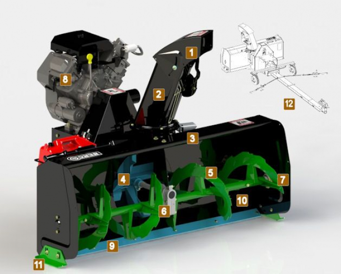Pracovný záber 122 cm (48 "), benzínový motor Kohler 14HP, elektrické štartovanie, úplne bezúdržbová prevodovka, elektromagnetická spojka, rýchla montáž na väčšinu ATV / UTV za menej ako 5 minút, plne elektrické ovládanie priamo zo sedadla vodiča