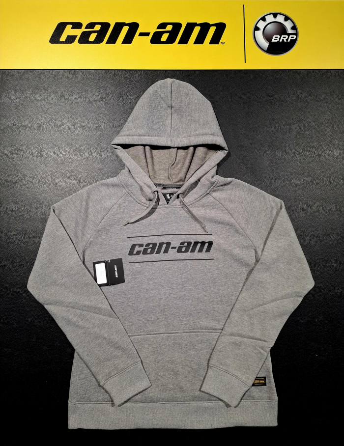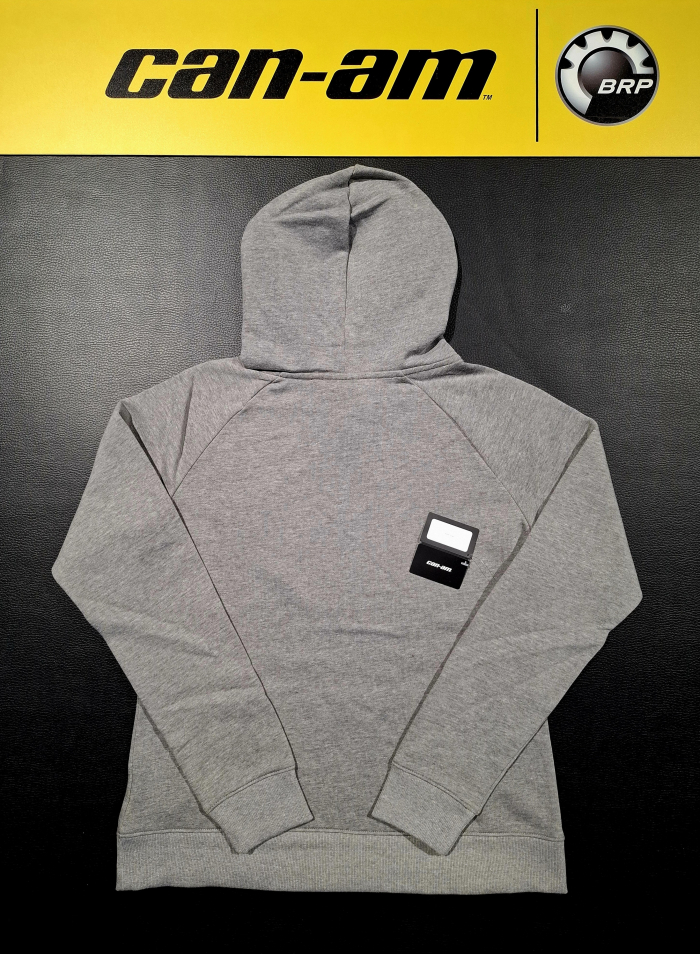 Dámska mikina BRP v sivej farbe s kapucňou a dlhými rukávmi a čiernym logom Can-Am