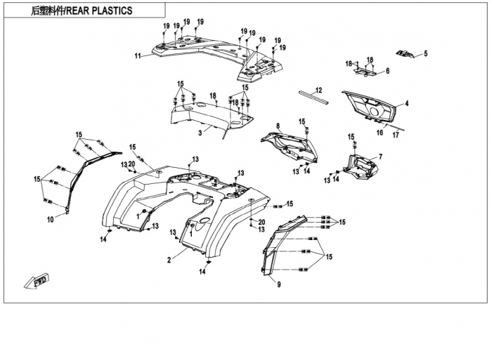 NÁHRADNÉ DIELY CF MOTO X850 - Zadné plasty (čierna, camo, oranžová)