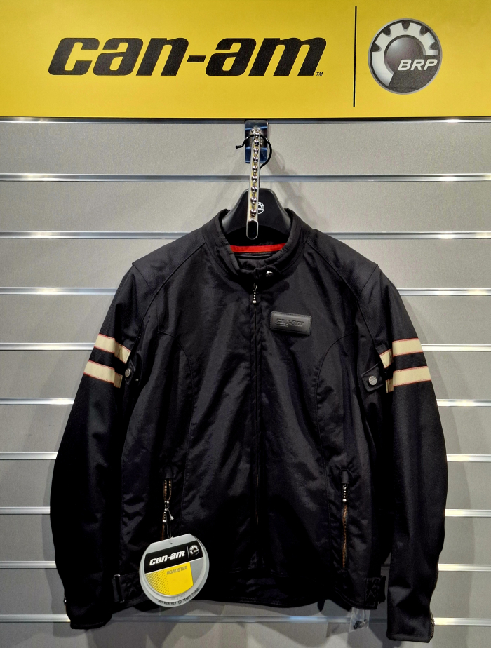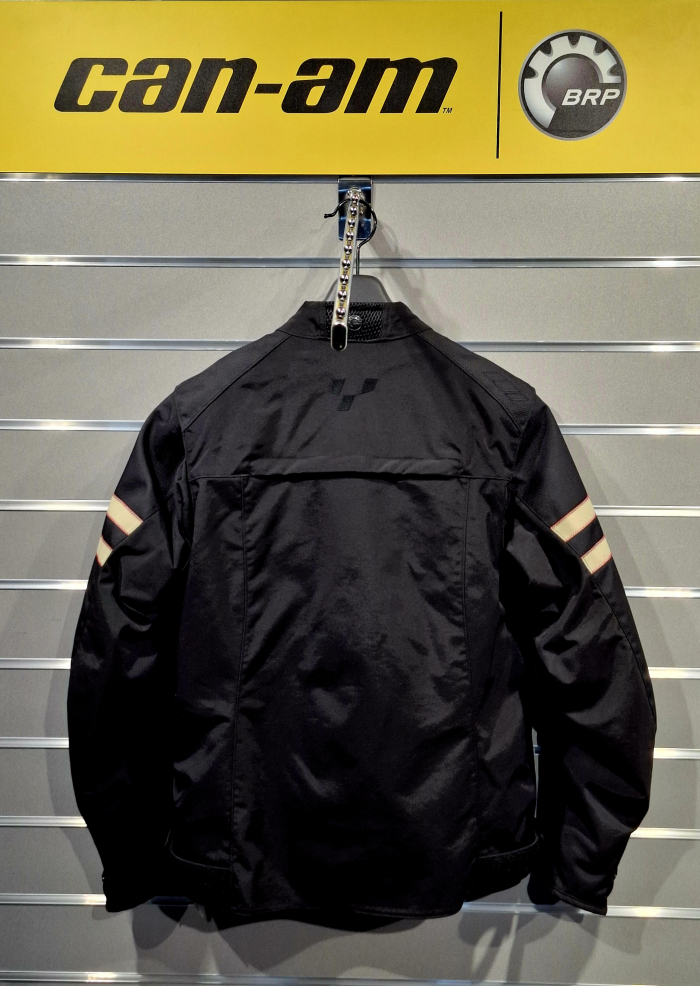 Pánska bunda BRP v čiernej farbe s bielymi pásmi na rukávoch s logom Can-Am Spyder, bez kapucne, logo can-am na prednej strane, Spyder logo vzadu