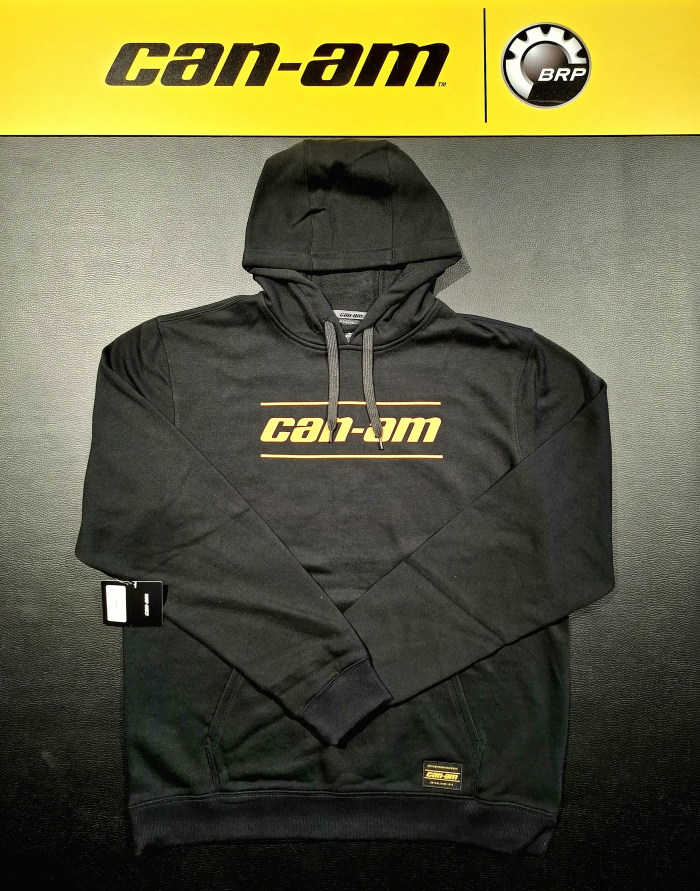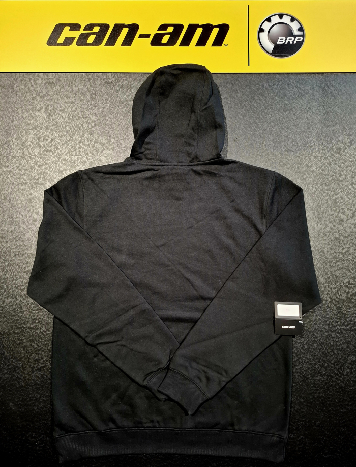 Pánska mikina BRP v čiernej farbe s kapucňou a dlhými rukávmi a veľkým oranžovým nápisom Can-Am