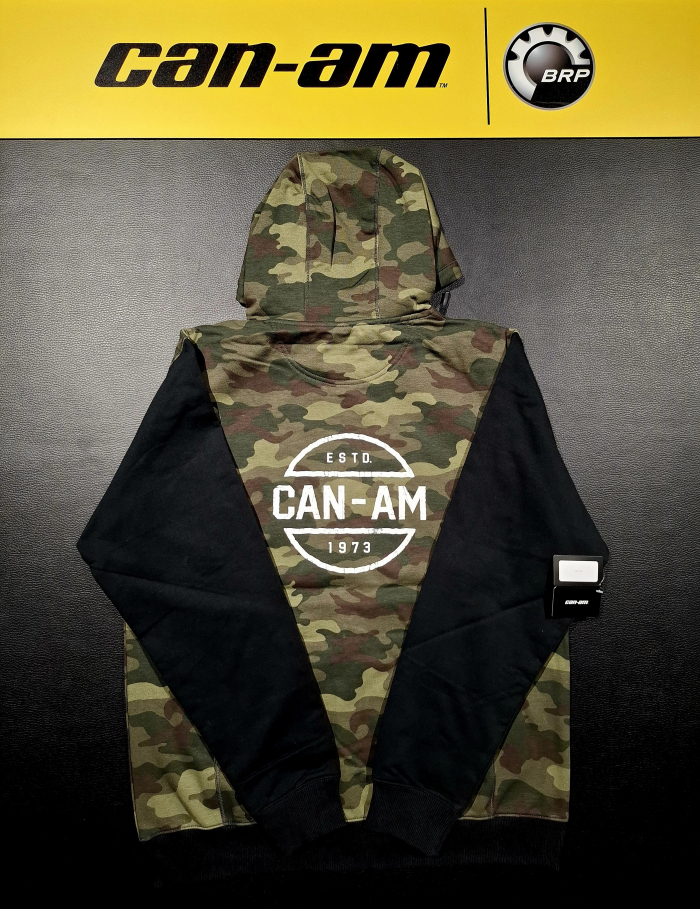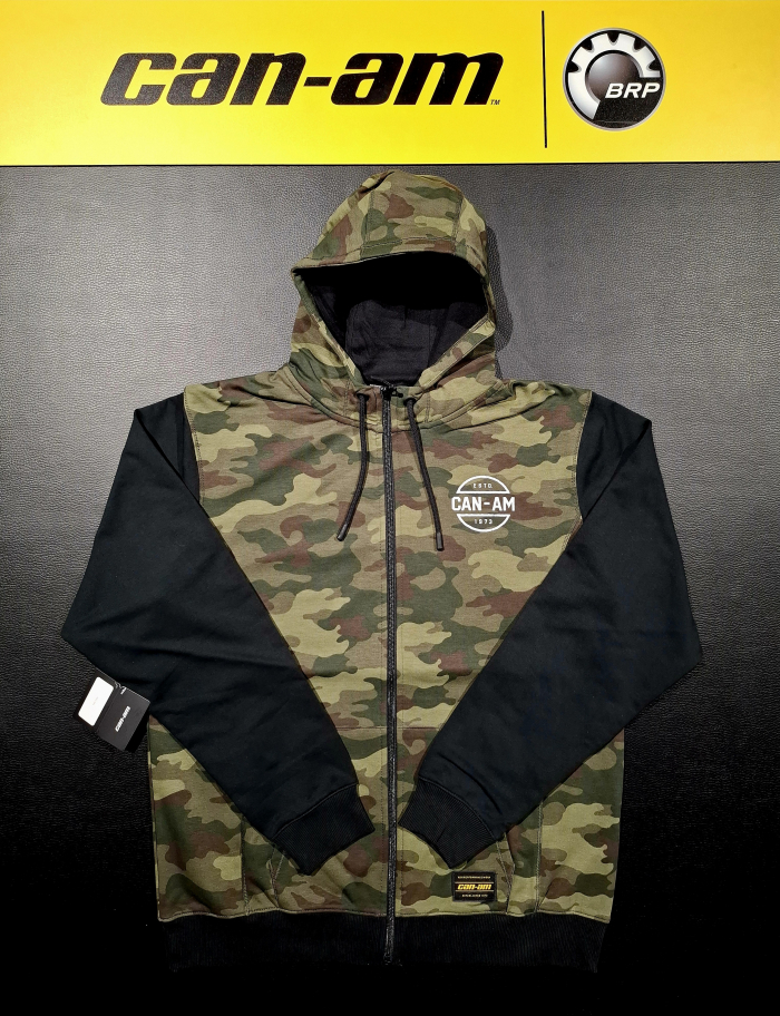 Pánska mikina BRP v kamuflážovej listovej farbe na zips s kapucňou a dlhými čiernymi rukávmi, obojstranná potlač, veľké biele logo Can-Am na zadnej strane