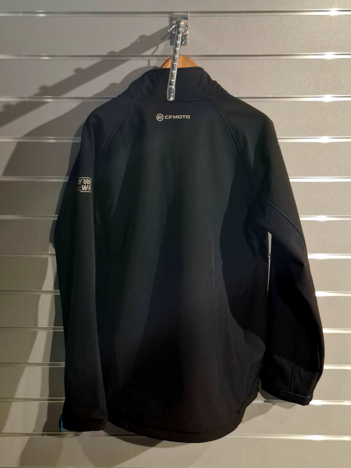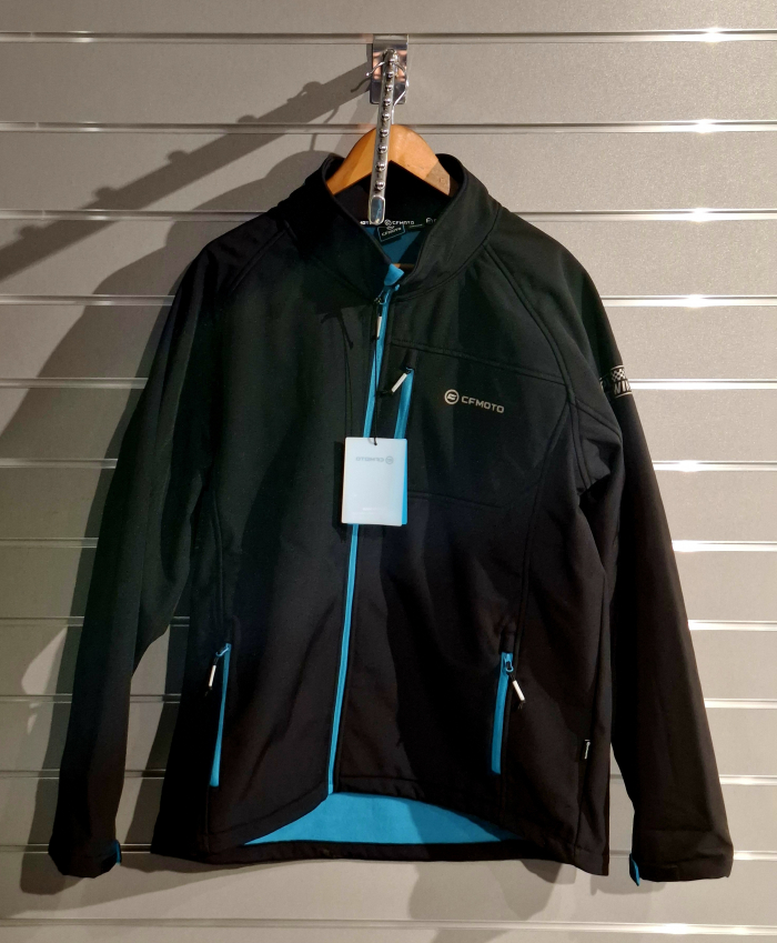 Pánska mikina CFMOTO, čierna s modrými prvkami, rozopínateľná zipsom, dlhý rukáv, vrecká na zips, biele logo CFMOTO