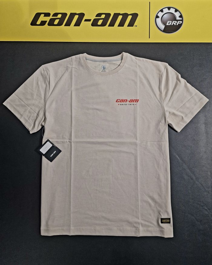 Pánske tričko BRP v pieskovej hnedo-sivej farbe s potlačou a červeným nápisom Can-Am, obojstranná potlač