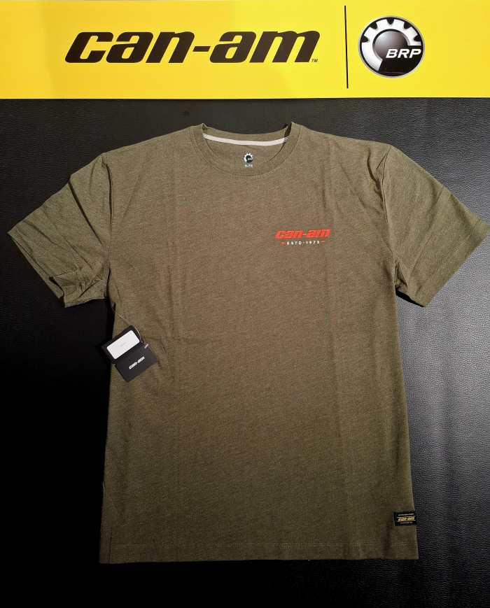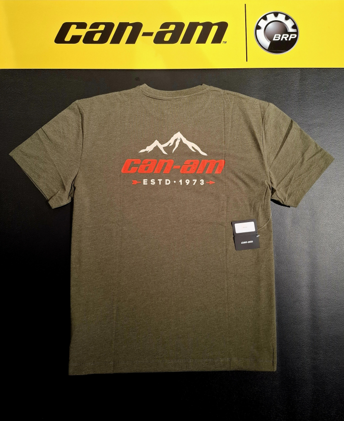 Pánske tričko BRP v zelenej farbe s potlačou a červeným nápisom Can-Am s motívom hôr