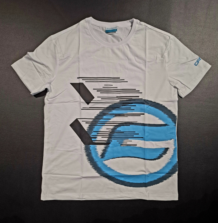 Pánske tričko CFMOTO v bielej farbe s krátkym rukávom, veľké výrazné modré logo na prednej strane
