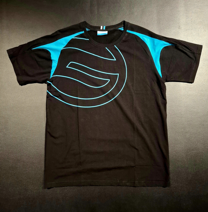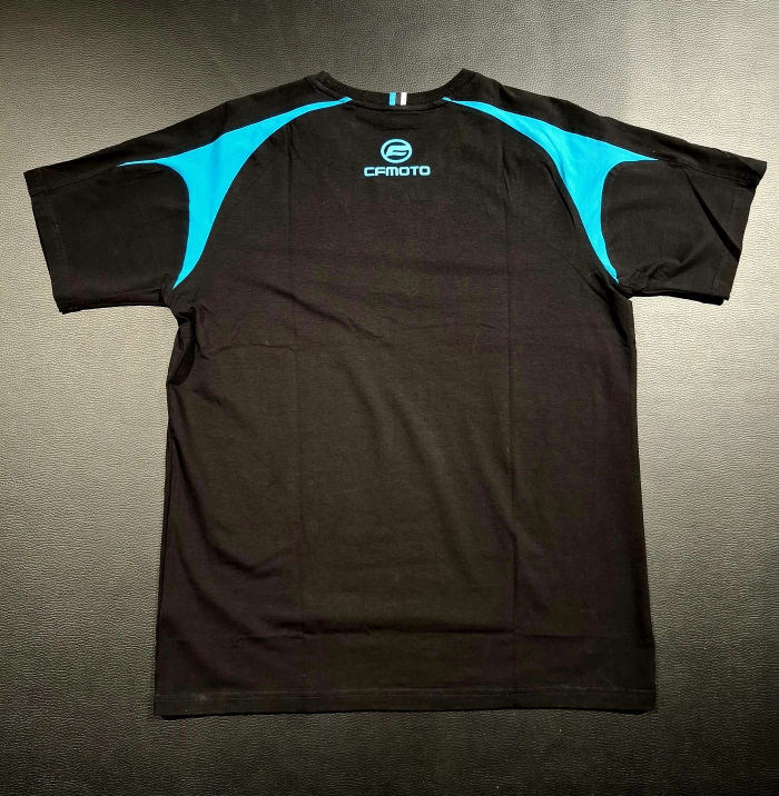 Pánske tričko CFMOTO v čiernej farbe s krátkym rukávom, veľké výrazné modré logo na prednej strane