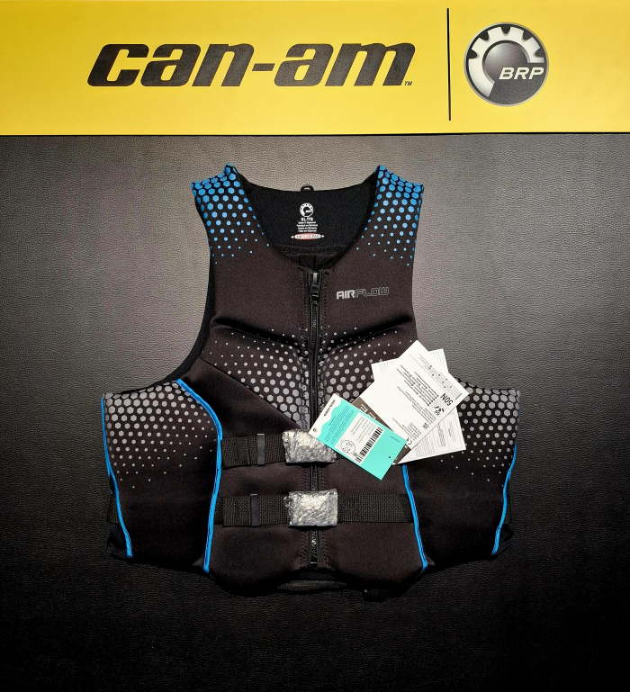 Unisex plavecká vesta Sea-Doo Airflow čierna s modrými prvkami, nadľahčuje a stabilizuje polohu tela na vodnej hladine