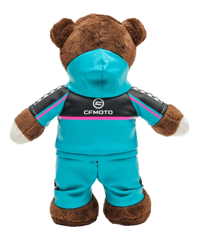 Plyšový medveď v koženej rozopínacej kombinéze s kapucňou. Špeciálna edícia v darčekovej krabici pri príležitosti 35.výročia značky CFMOTO.
