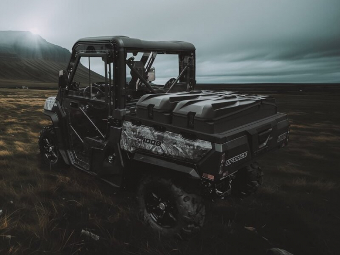 Objemný uzamykateľný box značky Tesseract pre CFMOTO GLADIATOR U10 PRO/XL. Inštaluje sa priečne na korbu stroja, možno usadiť až dva kufre vedľa seba. Nieje kompatibilný s krytom alebo nástavbou korby.
